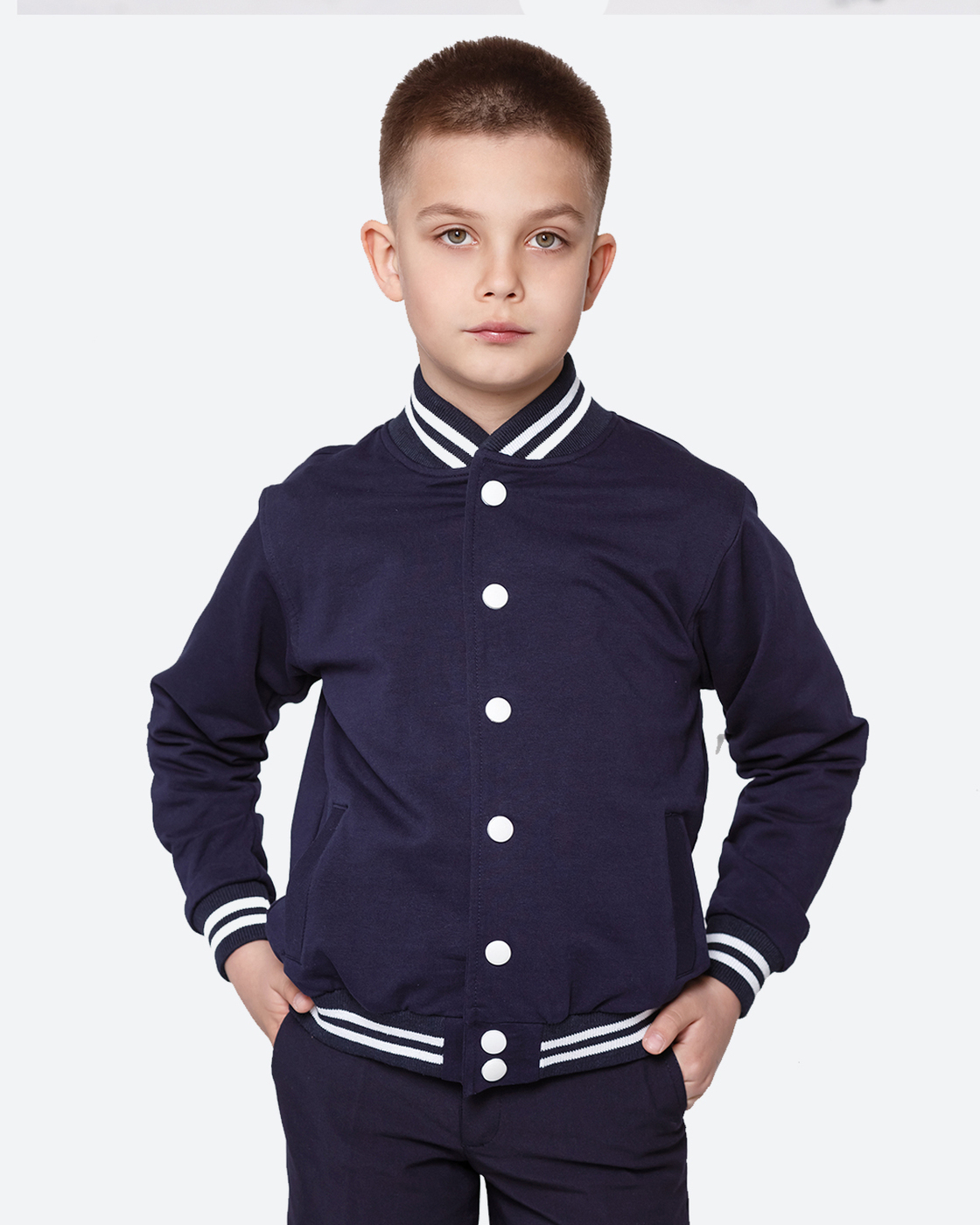 Классный бомбер из хлопкового трикотажа отделан широкими контрастными резинками в полоску, застёгивается на кнопки, по бокам два кармана. Идеален для школы, прогулок, спорта, также может служить дополнительным тёплым слоем под куртку зимой. Высококачественная ткань великолепна в эксплуатации. Отличное универсальное приобретение для современного ребёнка!