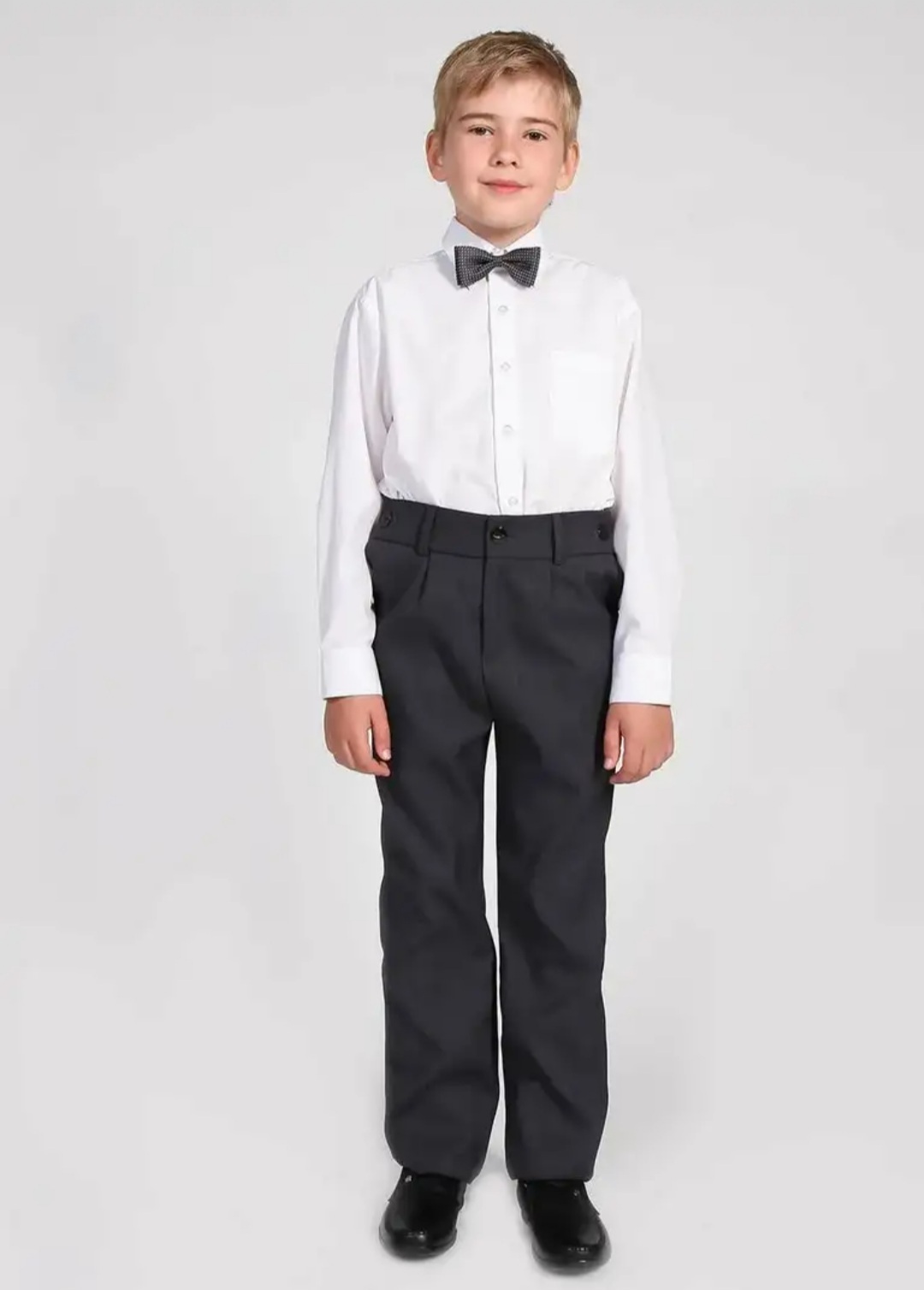 Строгие классические брюки для мальчика прямого покроя из плотной костюмной полушерстяной ткани для холодного времени года. Прекрасно носятся, не закатываются, не линяют, держат форму. Модель позволяет разгладить стрелки и носить как полуклассику.