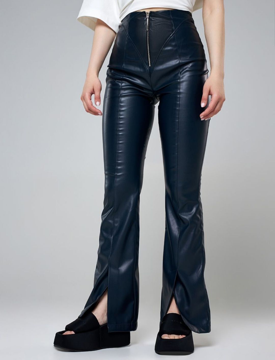 Брюки штаны женские для девушки девочки кожа кожанные эко-кожа клёш от колена с разрезами модные синие темно-синие