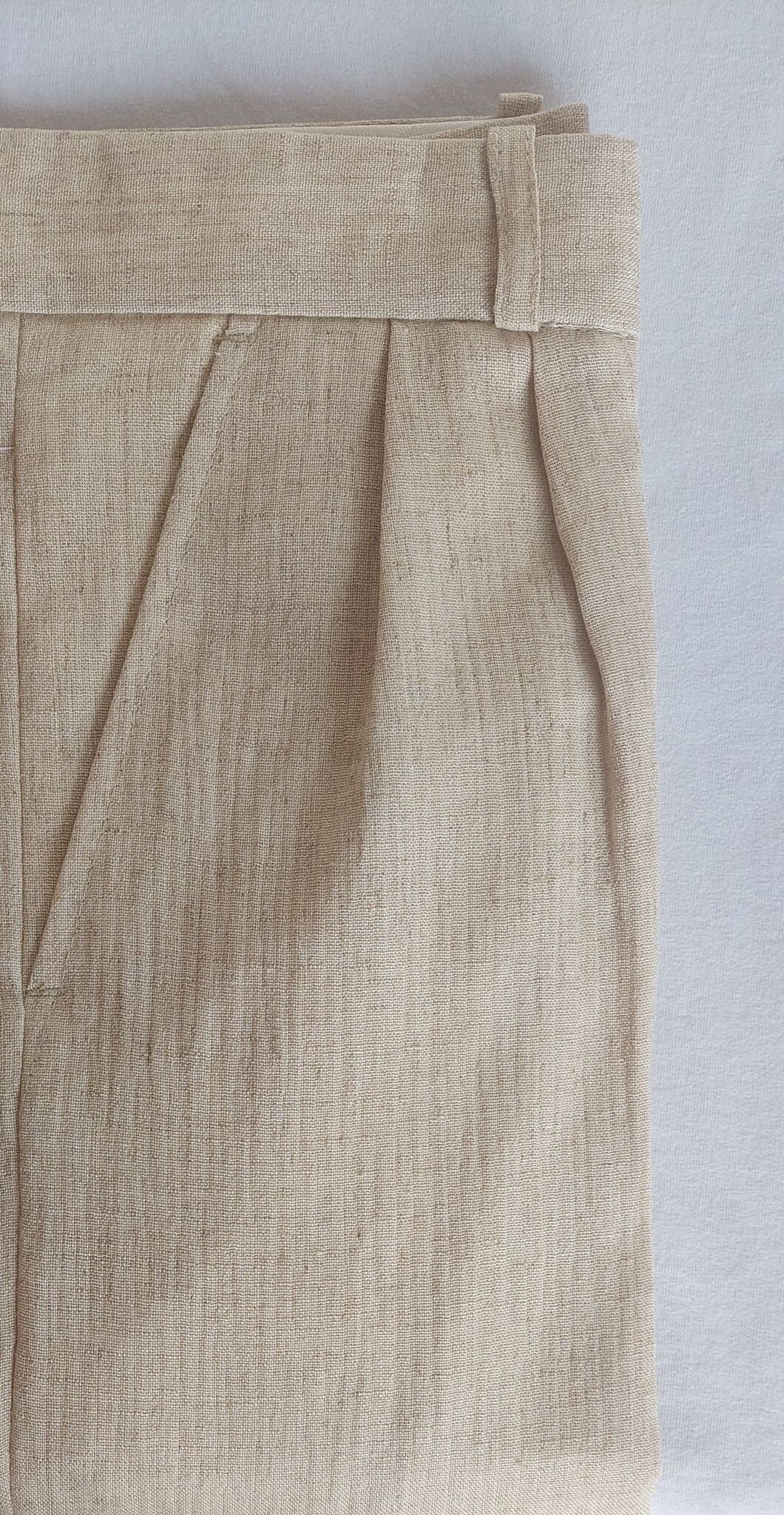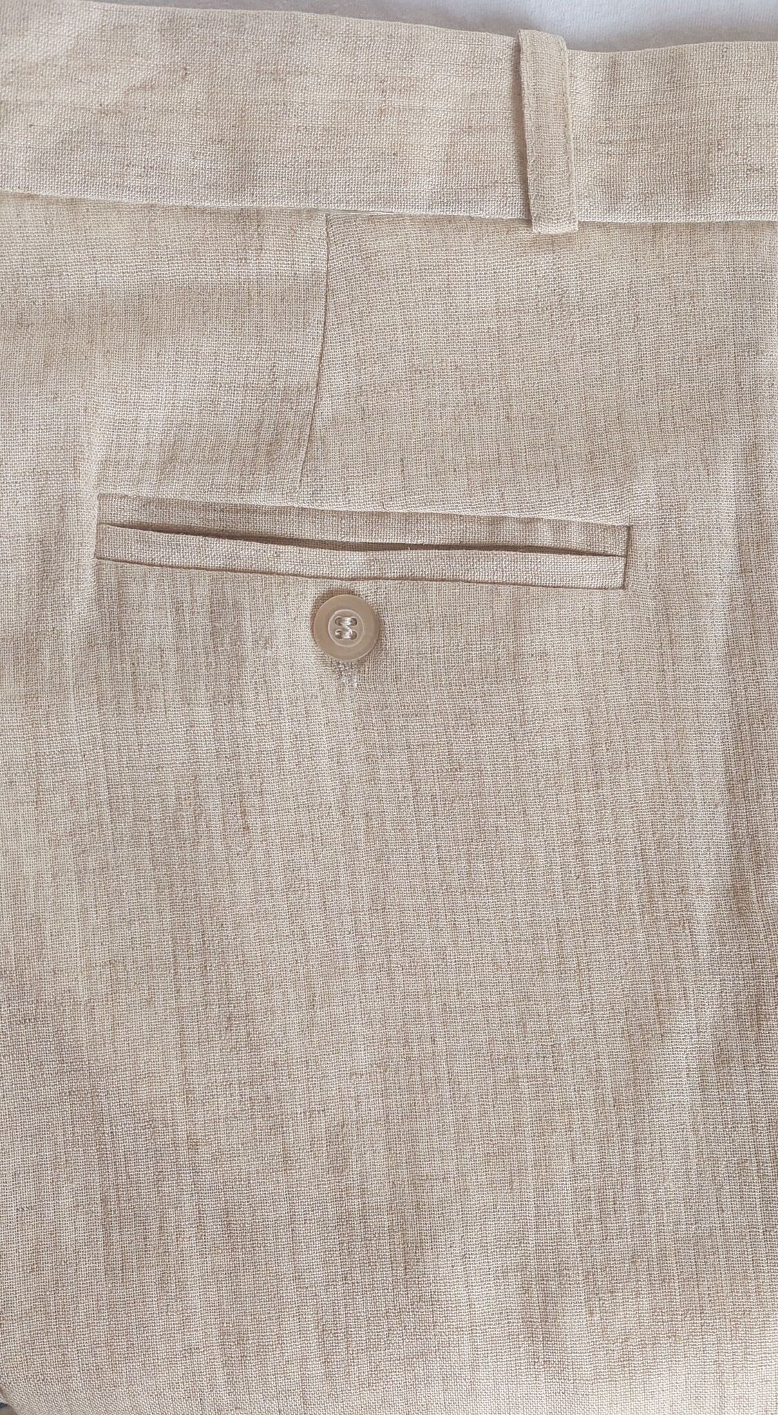 ОБЯЗАТЕЛЬНО постирать слегка тёплой воде перед подшивом брюк, ткань немного сядет в длину, затем подогнать по высоте.