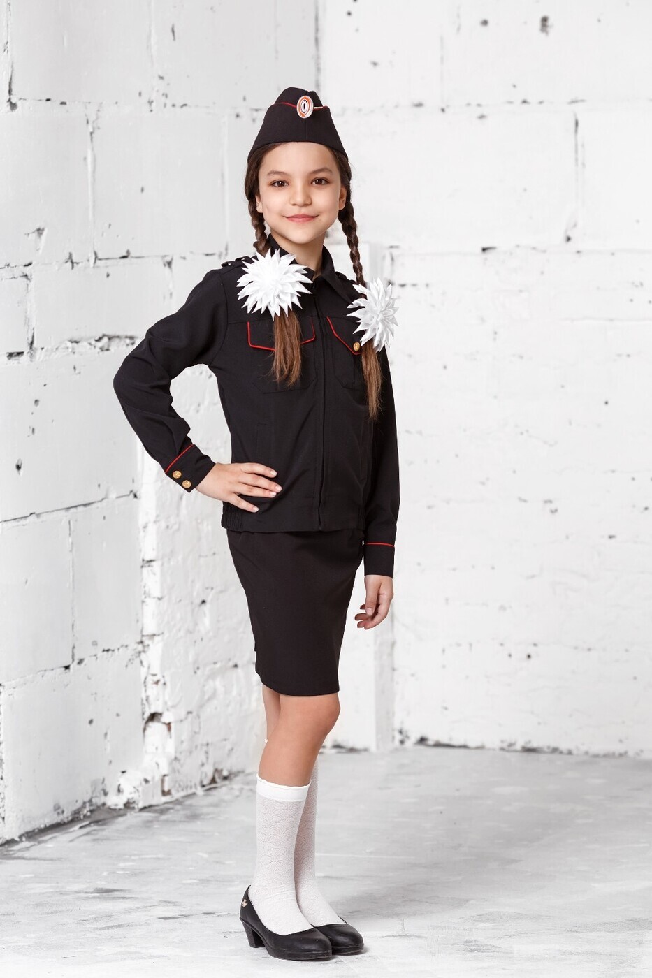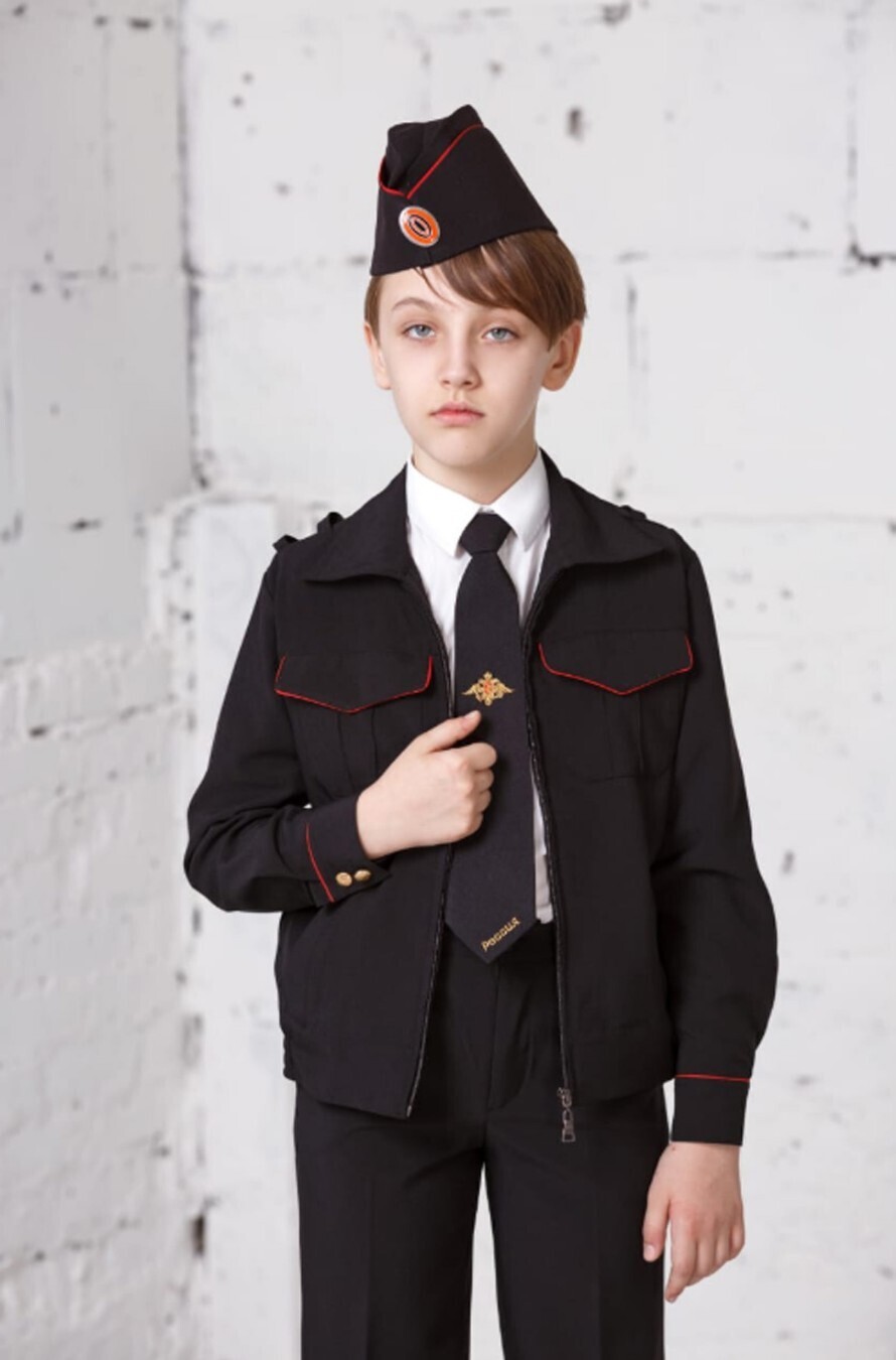 Комплект школьный форменный - куртка и галстук - для учеников казачьих классов. Куртка на воротнике, клапанах нагрудных карманов и на манжетах отделана красной каймой, рукава застёгиваются золотистыми пуговицами с гербом. 2 нагрудных и 2 боковых кармана. По бокам на поясе резинка-регулировка. Без подклада. Ткань ноская и практичная.