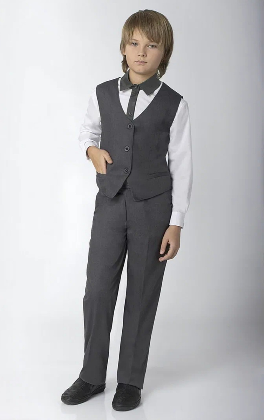 Строгий элегантный костюм (жилет и брюки) идеален для школы и других ответственных детских мероприятий.