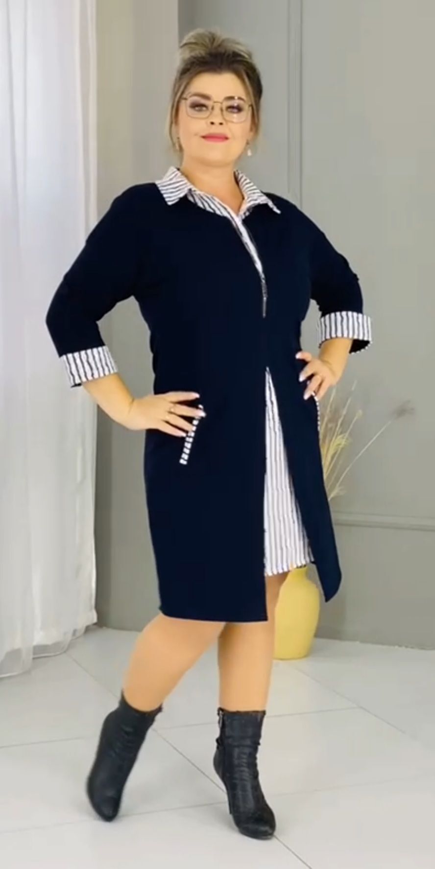 Платье женское большой размер 54 трикотаж трикотажное обманка тёплое зимнее весеннее осеннее демисезонное чёрное черно-белая полоска полосатое ненарядное повседневное на работу комфортное удобное 3/4 рукав великан 4XL XXXXL 5XL XXXXXL 6XL 7XL 8XL